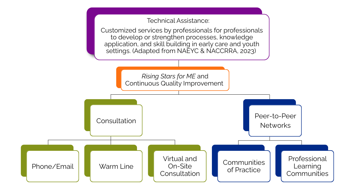 Request Virtual or On-site ConsultationMaine Roads to Quality Professional Development Network has created a statewide system to offer technical assistance (TA) services to early childhood and out-of-school time programs working to improve program quality. The TA System supports the reflective processes that practitioners need in order to apply the theories and information learned through education and/or training to improve or sustain best practices. Our ECE Program Quality Specialists can support you and your program with a wide variety of services.